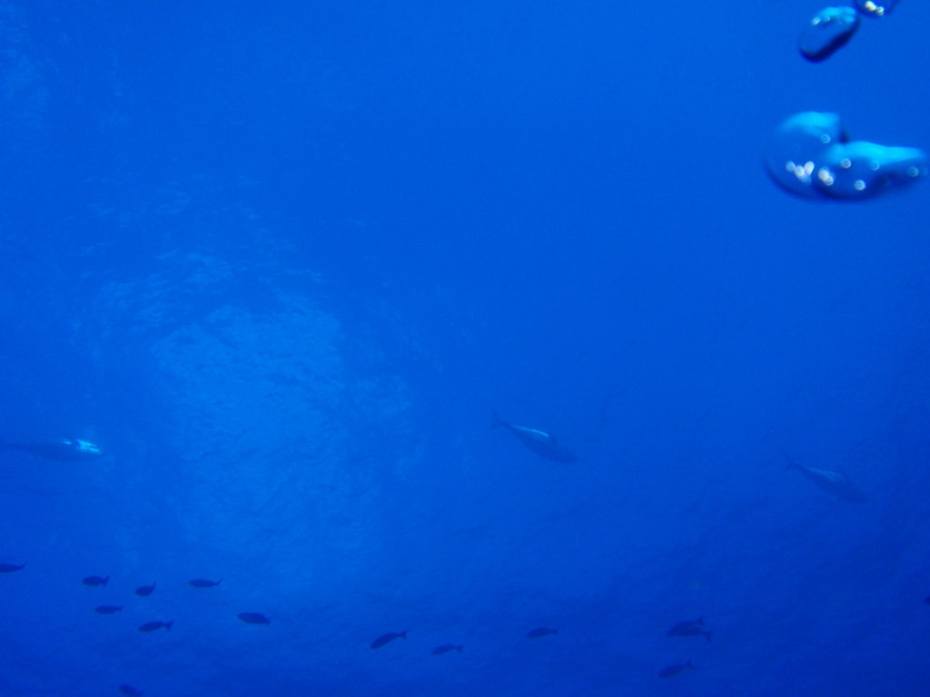 ちょうど水深20m付近から水面を見上げると、1mくらいのマグロが次から次へと